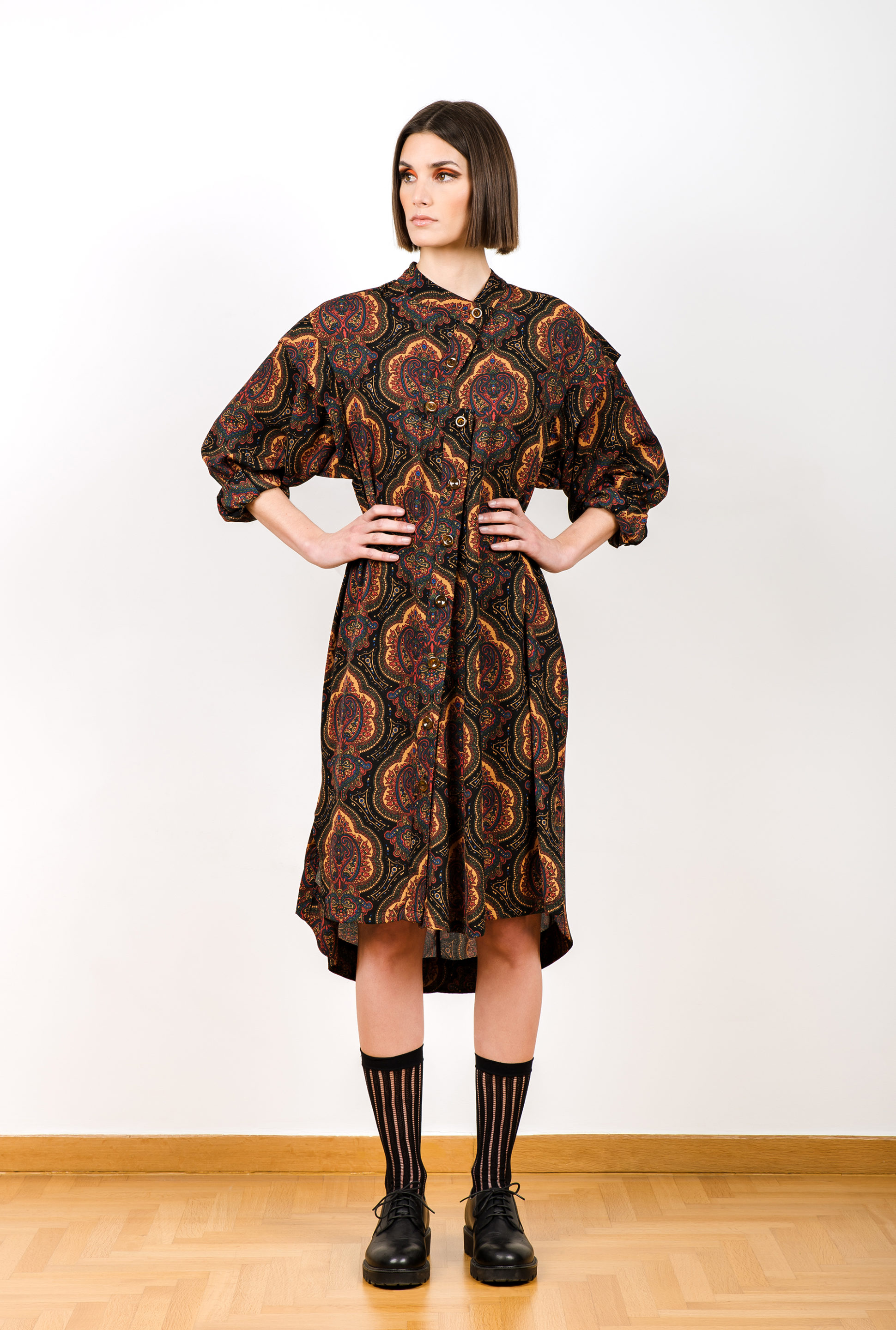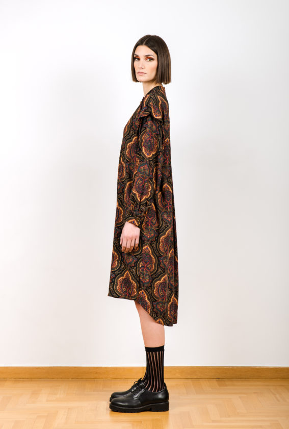 Μακρύ ασύμμετρο πουκάμισο με λοξό κούμπωμα, πιέτα πίσω και mao γιακά. Κρουστή συνθετική ζορζέτα με τύπωμα λαχούρια.