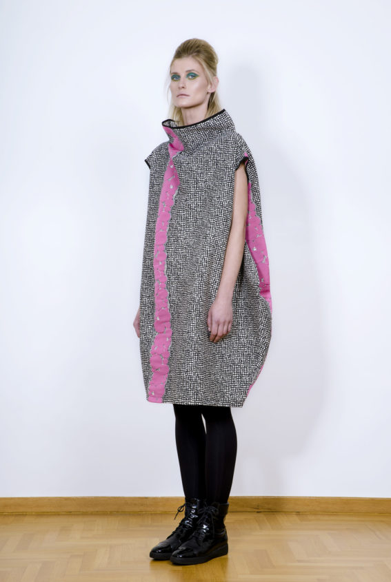 Onezise/oversized φόρεμα με ψηλό γιακά. Το φόρεμα ανοίγει στις πλαϊνές ραφές δημιουργώντας δύο τρίγωνα. Στητό, jacquard ύφασμα σε μπεζ- μαύρο χρώμα, με απλικέ ροζ κύκλους που σχηματίζουν κάθετη γραμμή. Βαμβακερό μαύρο ρέλι στον γιακά και τα μανίκια.